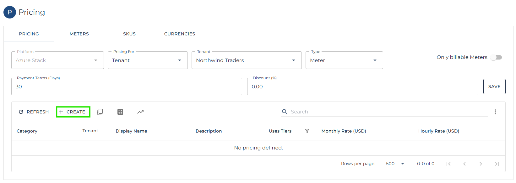 | Note: The tenant specific price list will apply during the next usage collection run or can be updated on demand in the pricing page using the recalculate button. |